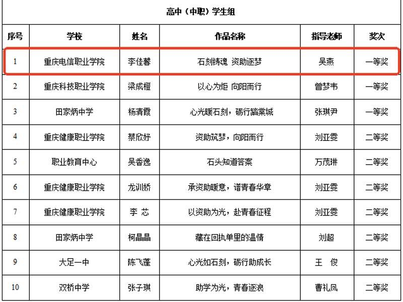 12月3日上午,大足区教育委员会主办的2025年“心光·砺行—‘石刻’助你成长”主题系列之“点燃希望 放飞梦想”演讲比赛在香国小学学术报告厅隆重举行,赛事分为教师组、小学生组、中学生组及高中(中职)生组四个组别,吸引全区102名优秀选手同台竞技。我院2024级李佳馨同学参赛期间,紧扣演讲主题,以细腻笔触诠释感恩之心,用质朴话语传递真挚情感,在激烈角逐中脱颖而出,最终荣获一等奖。